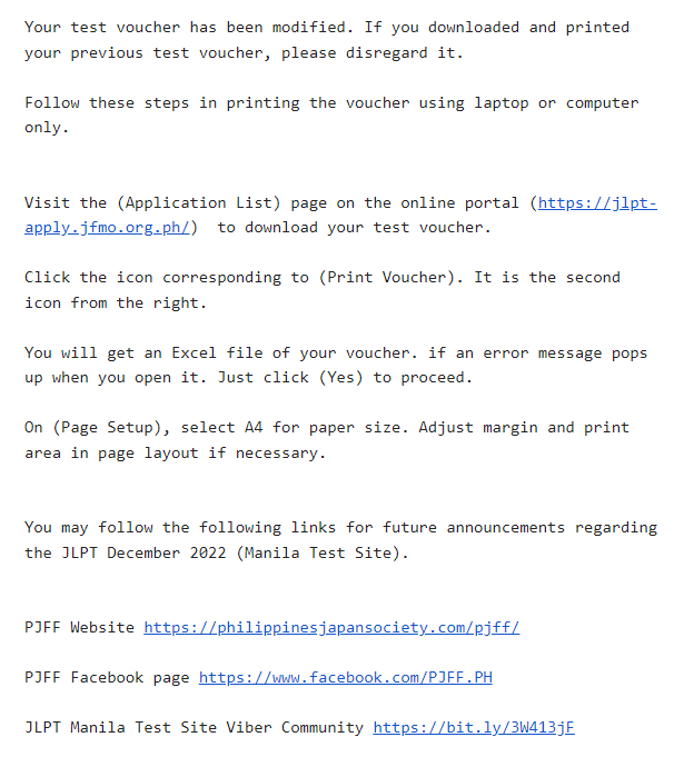 PJFF has modified the print settings for the JLPT test voucher. The voucher must be printed on A4 size paper.
